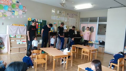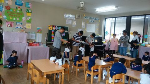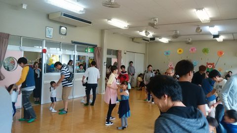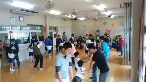 保育参観後、園庭で小運動会を行う予定でしたが、雨のため、多少、予定を変更し、ゆうぎ室で行いました。