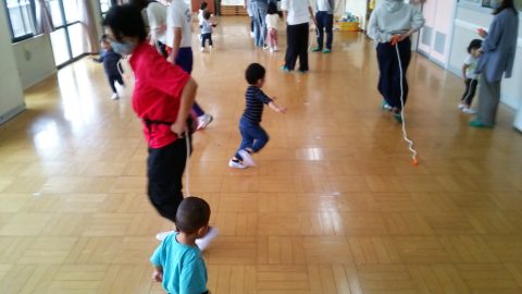 今日のコロちゃんクラブは、なわを使って、クネクネヘビ、しっぽ取り、左右にジャンプ、タクシー等であそびました。
