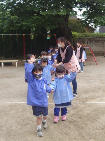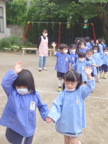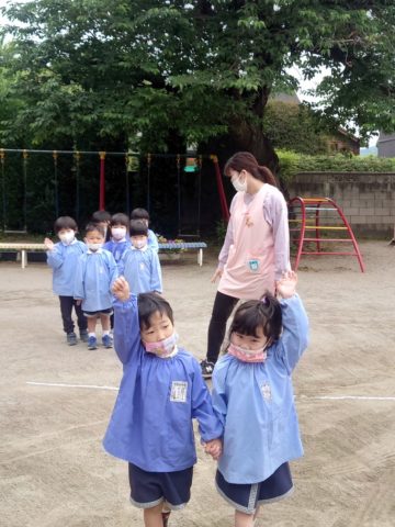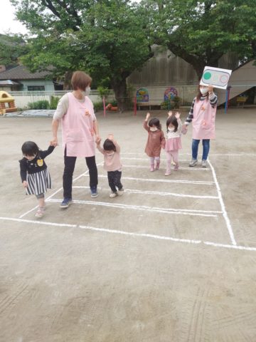 信号の絵や紙芝居を使って、安全な道路横断の方法を学び、園庭に出てやってみました🚥