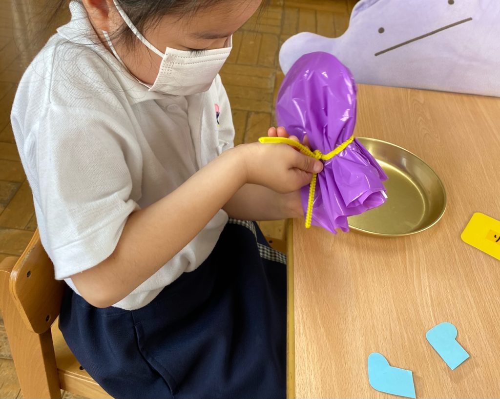 レインコート、長靴、モール、模様のシールやマスキングテープ、子どもたちそれぞれが好きな色を選びコーディネートしまた!
